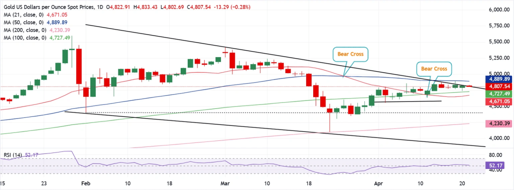 从负面来看,初步支撑位于$4,760–4,720 区域,前下降阻力线、100 日均线和 21 日均线聚集在此处,随后是大约在4,500年代中期的上升趋势线区域,如果卖压加大,则在 $4,230 附近的 200 日均线。从正面来看,直接阻力出现在下跌楔形的上边界附近 $4,81050 日均线。收盘价高于该水平对确认看涨突破至关重要,下一个阻力在 $4,890 附近的 50 日均线。持续突破该均线将为更有决定性的反弹至近期高点打开通道,而未能突破则将使 XAU/USD 维持在新建支撑位之上的盘整阶段。.